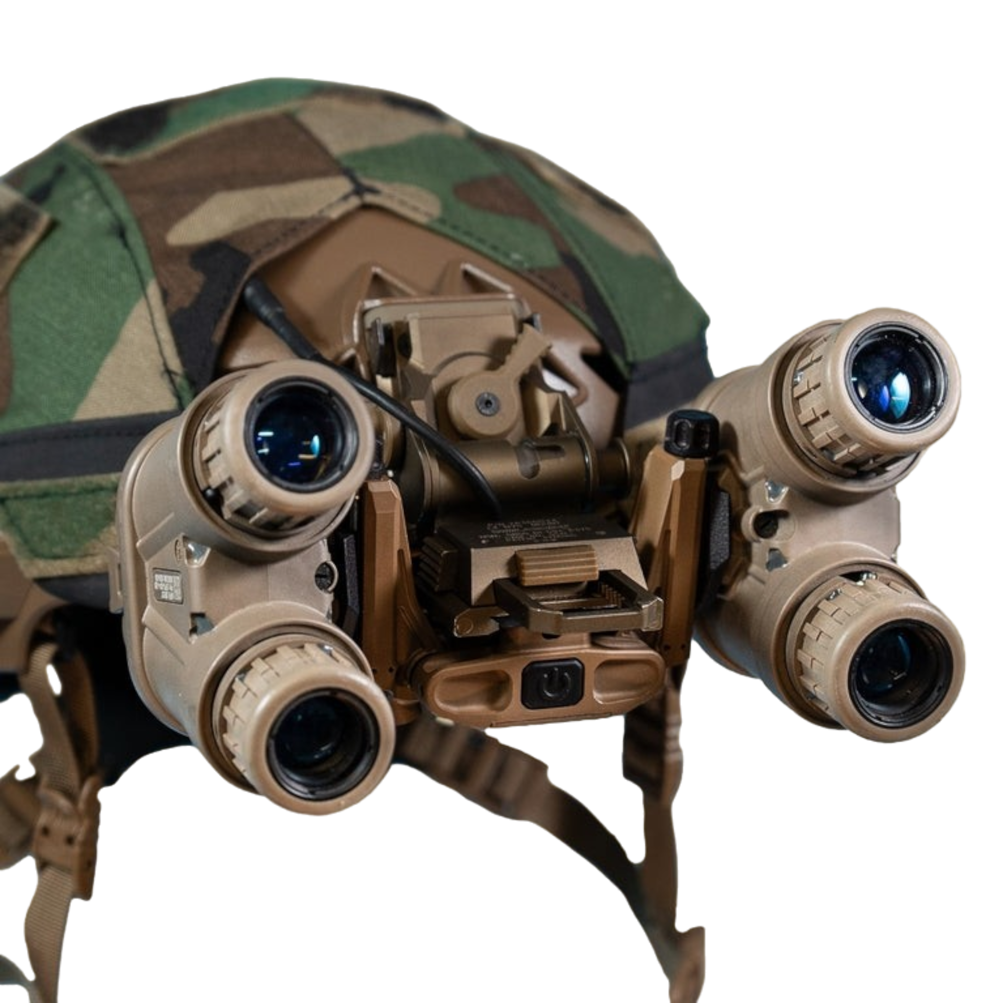 This patent pending system enables the lowest possible profile by stowing the pods back to the helmet to a profile typical of articulating binos reducing neck fatigue by pulling the center of gravity significantly closer to the natural pivot point of the neck. Panoramic system pods attached to the UAPNVG Bridge can be stowed individually without fully stowing the device which allows the user to clear door thresholds, increase head clearance in a vehicle, have rapid access to the night vision function, enter and exit vehicles much faster, reduced brush snag hazard, and use weapon mounted optics/thermal devices simultaneously with the goggle. The bridge system is plug and play at a user level with existing panoramic nvg pods offering compatibility with L3 GPNVG18, Lindu QTNVG, ANVIS10, and more.